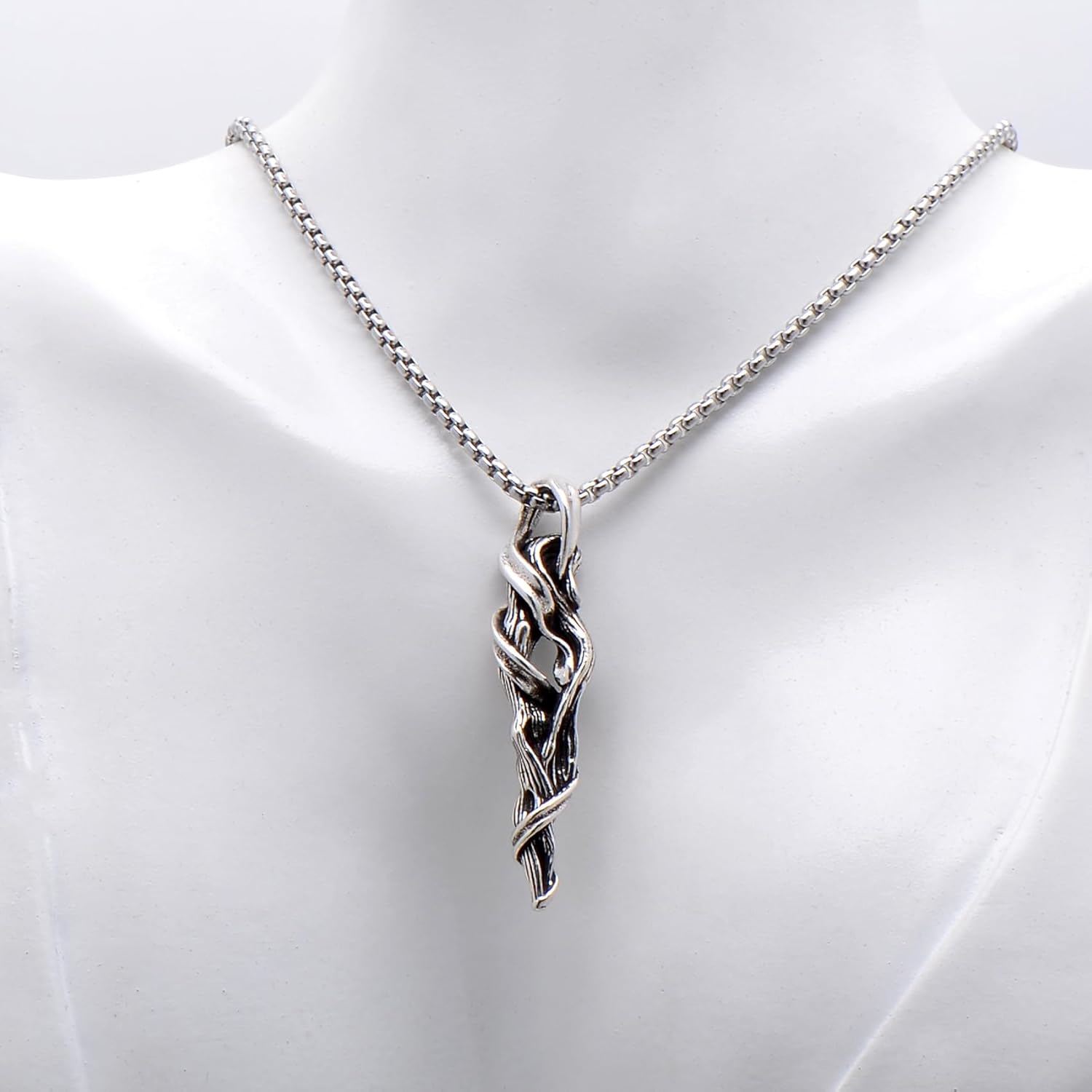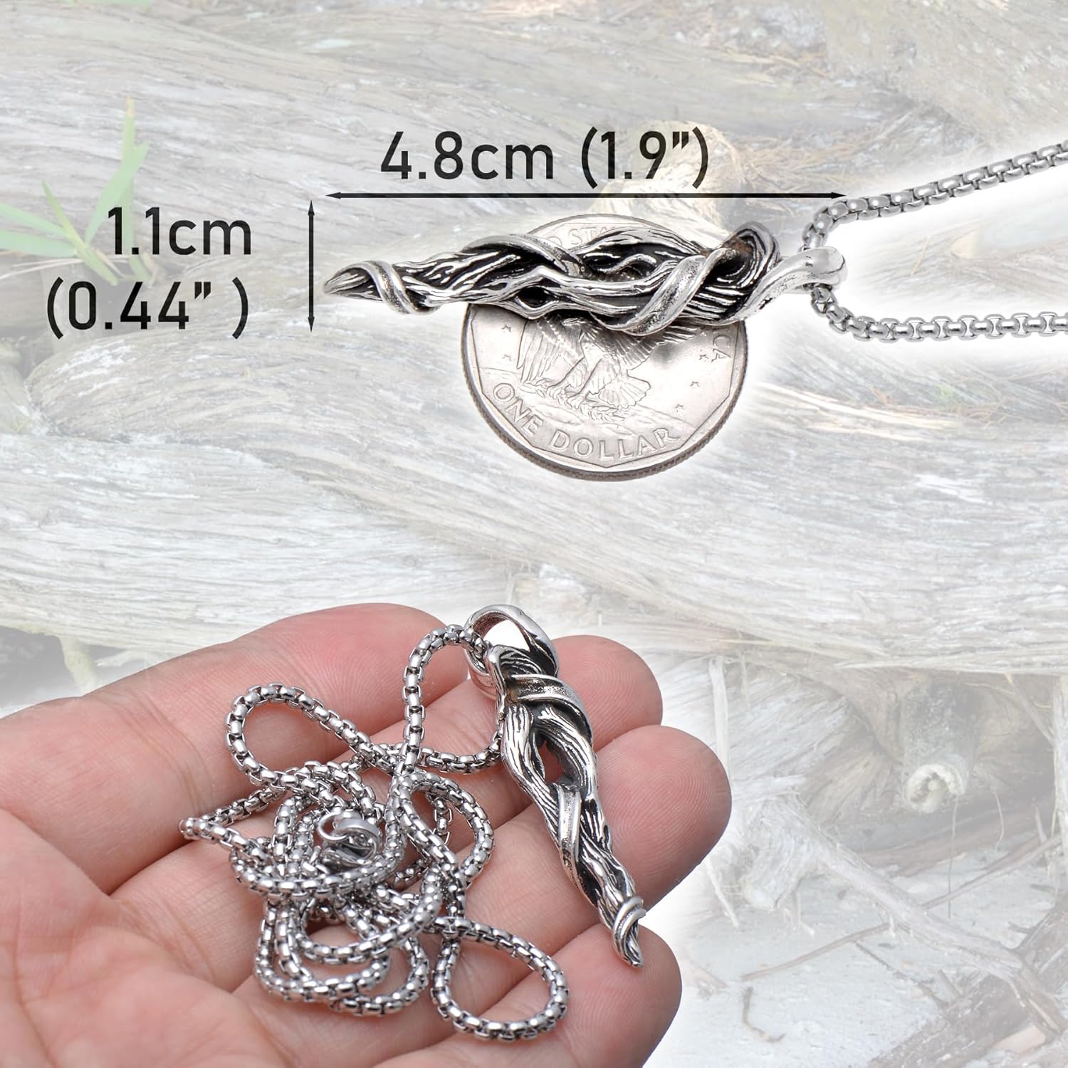 This is a beautiful and unique looking pendant. To me it looks like silver or stainless steel, rather than copper as the listing says. It's definitely silver toned. The twisted design is indeed reminiscent of driftwood but it reminds me more of the top of a wizards staff (what can I say - I read a lot of fantasy novels lol). The pendant has a nice weight and feel to it, and it isn't at all rough against my skin. It comes with a really nice rounded box chain too which really adds to the quality of the necklace as a whole. It says its for men, but I'm female and I wear it all the time - get lots of compliments on it too and people always ask where I got it. It comes packaged in a gift box and even has a polishing cloth included. Excellent quality for the price. Suitable for anyone who loves bold, unique pieces of jewelry and would make a great gift this holiday season.