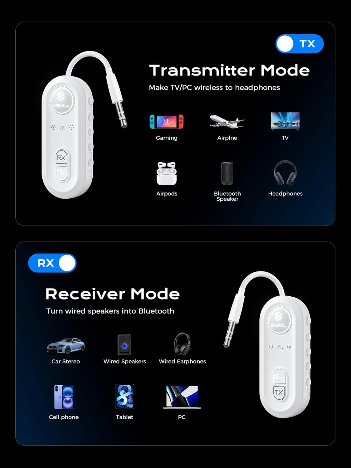 Headphone, PC, TV, Wireless Headset, Smartphone, Speaker, Car Stereo System, Television, Laptop, MP3 Player, Television