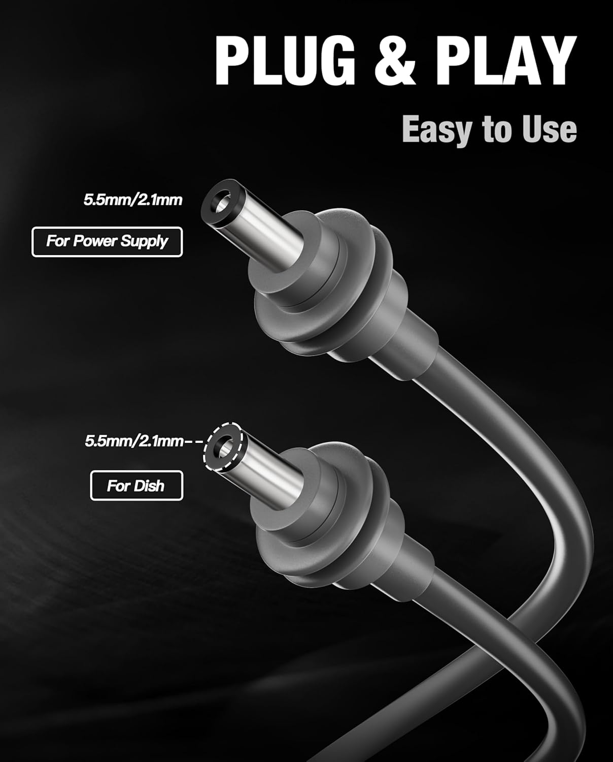 DC5521 male to male, 75 feet.Please note, at this length it may induce voltage drops below 24VDC.Be sure to check output voltage at far end if you have any issues.Good construction.Comes with velcro strap.Weatherproof when used with starlink mini.
