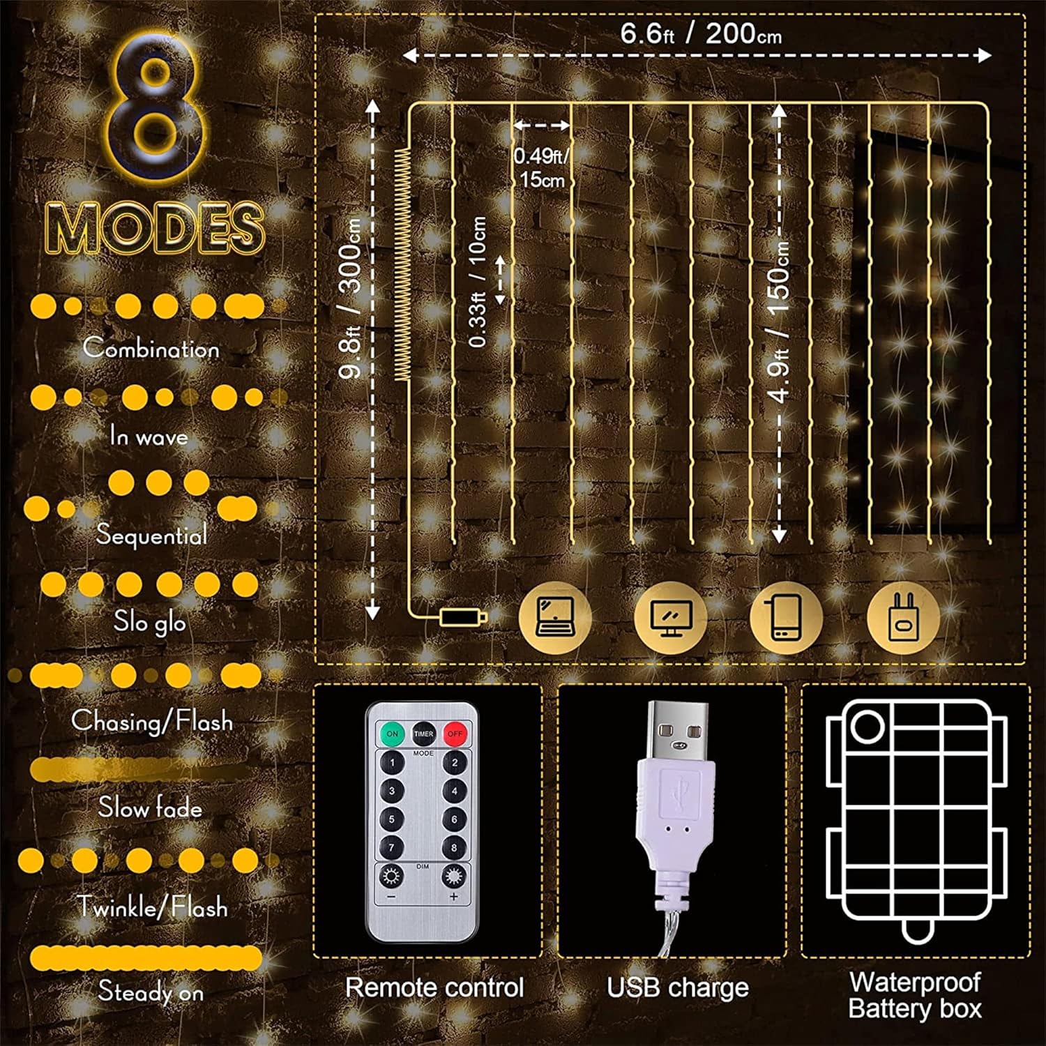 '1 x Curtain string light', '1 x Remote control', '1 x USB', '1 x Waterproof battery box'