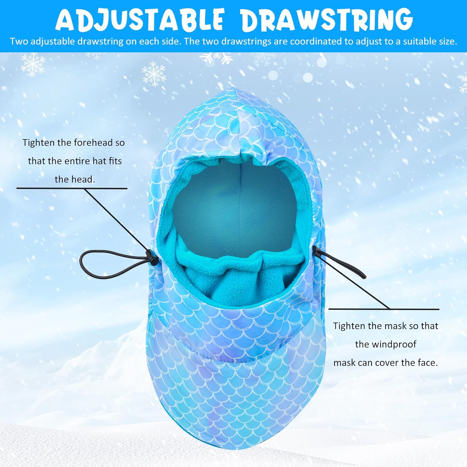 Adjustable, fits both the 7 year old's head and also my small adult head. It's easy to put on, warm, protects against wind and rain, and soft. A must have during the winter. They delivered super quickly too without any issues.
