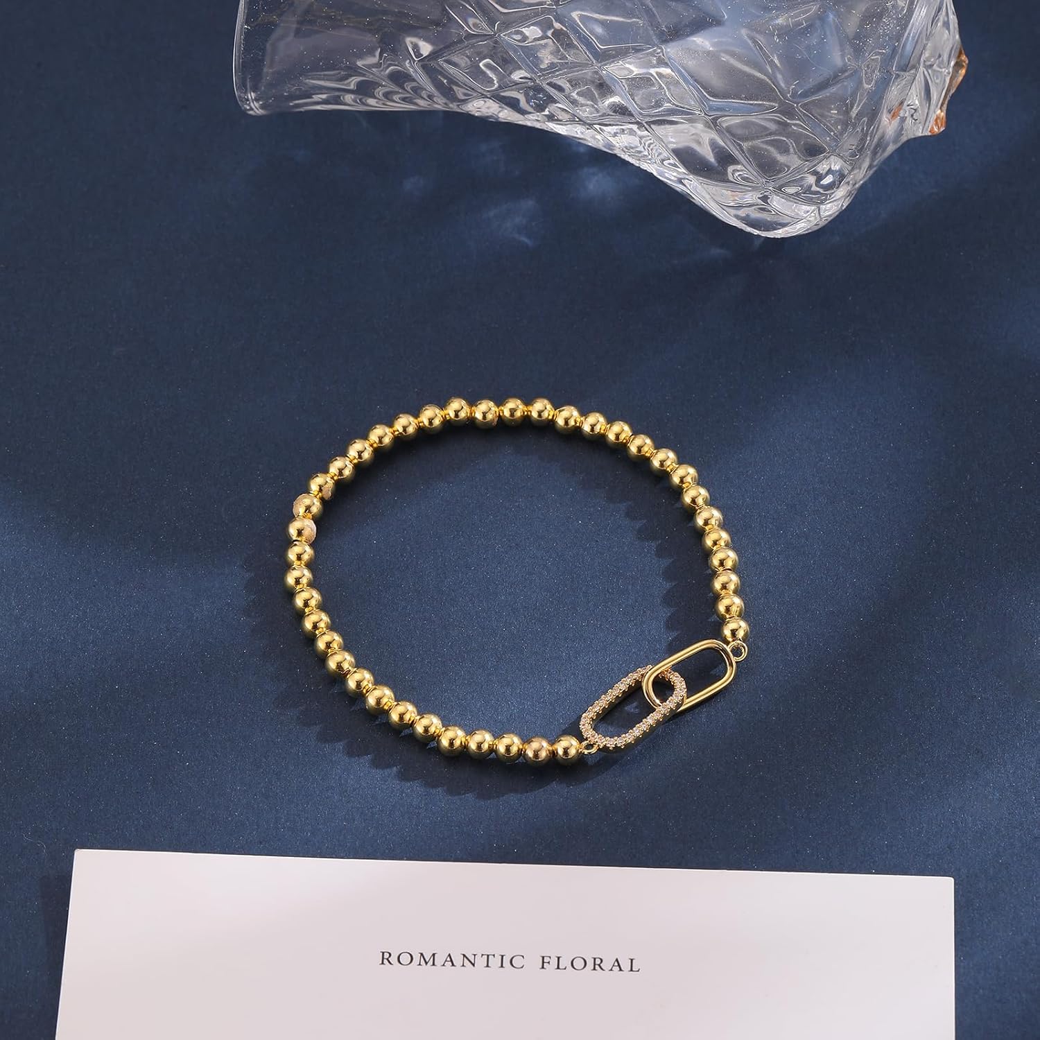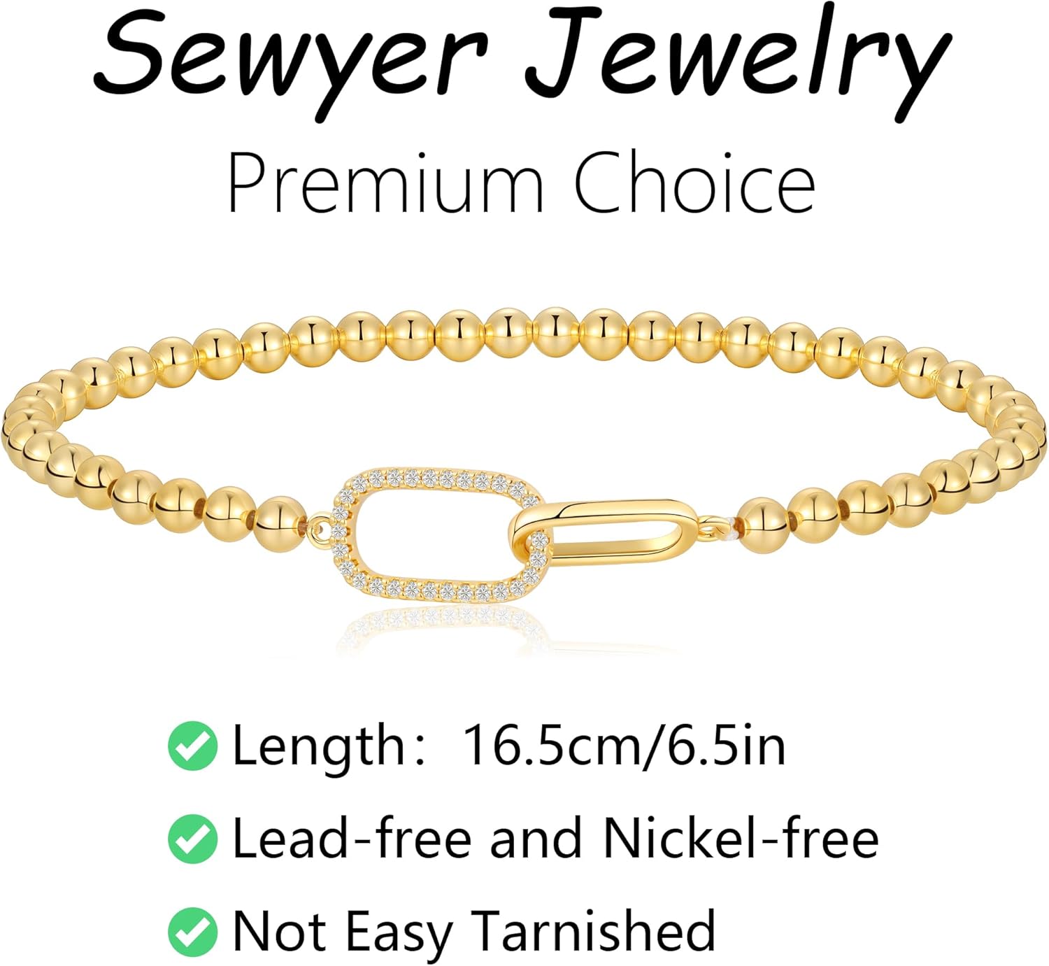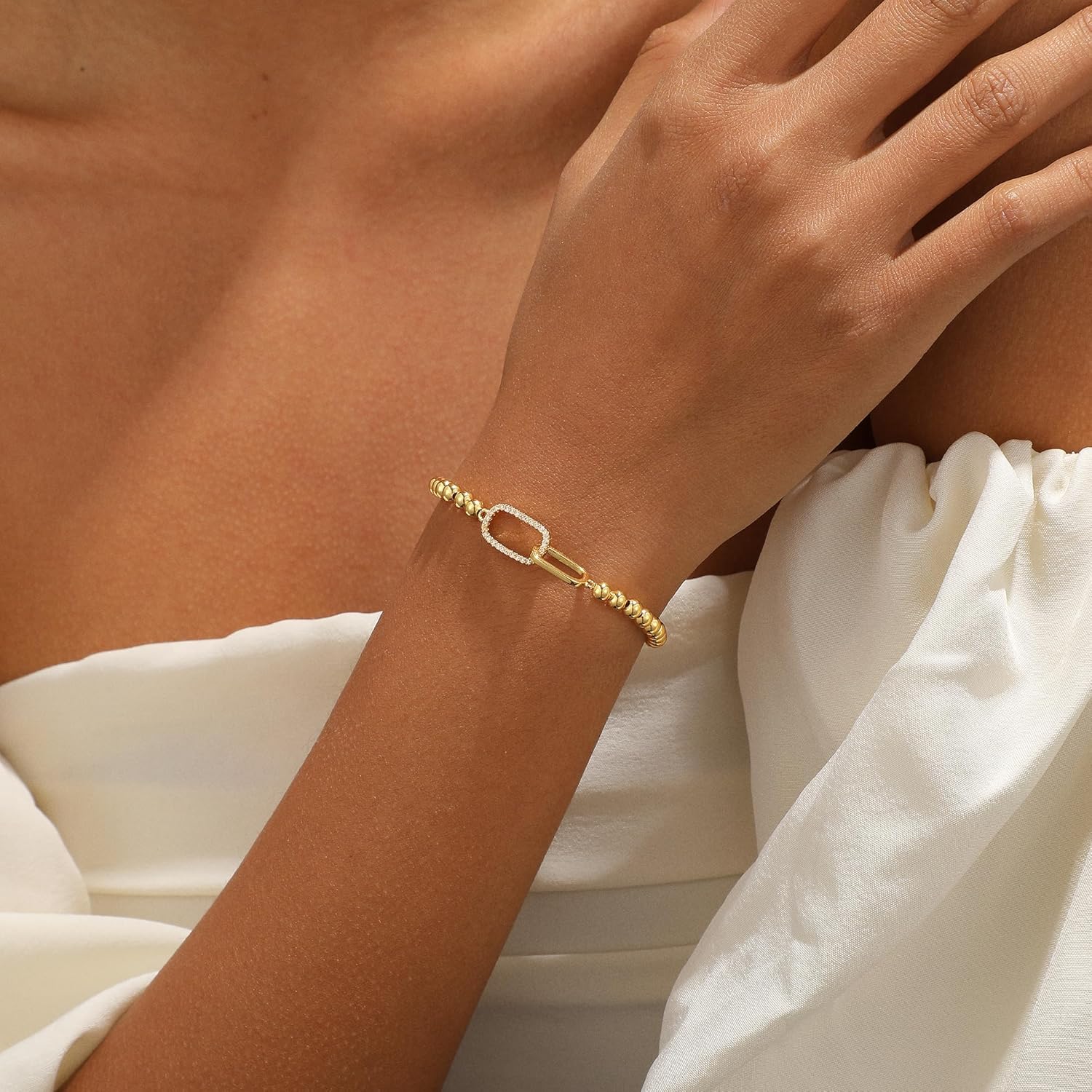 I absolutely love this bracelet. It’s chic without being flashy and adds just the right amount of elegance to elevate an outfit. The gold-tone beads have a beautiful shine, and the interlocking square links in the center give it a modern, refined look that stands out while still feeling subtle.The stretchy band is very well made. It has enough give to slide comfortably over the hand but feels secure once it’s on. It doesn’t feel flimsy or loose, which is something I really appreciate with stretch bracelets. It sits nicely on the wrist and layers well with other pieces, but it’s also pretty enough to wear on its own.Overall, this bracelet feels thoughtfully designed and high quality. It’s so lightweight: not in a tacky, cheap way but in a comfortable-I-could-always-wear-this way. It’s an easy, versatile piece that makes even simple outfits look more put together.