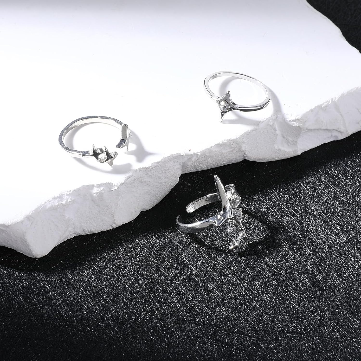 These are basic costume jewelry rings available for a low price. You get what you pay for. They are of an average quality. Only two of the three are adjustable, and I feel like I have to be very careful in trying to pull it to make it bigger. So far, nothing has broken for me. But to be honest, for this low price, I didn't expect them to be spectacular. They are pretty, with diamond-like gems in silver settings. The silver is not a shiny and bright finish, but a more goth-like darker finish, which I like. The two adjustable rings fit my size 10 finger, but the non-adjustable one is too small for me. I like the variety of styles and can wear these either all at once or one at a time.